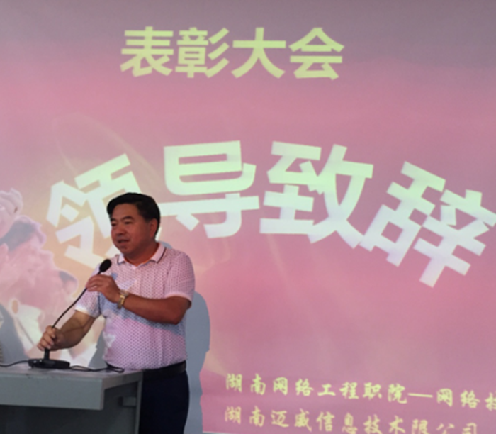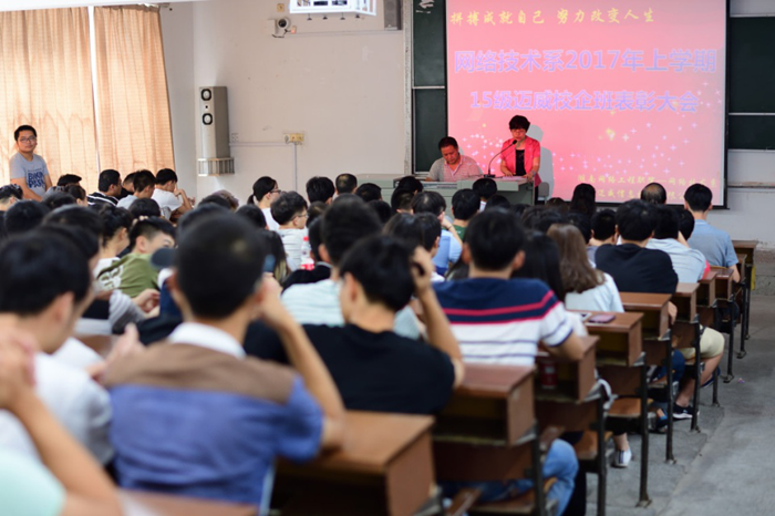 9月7日中午,网络技术系以“拼搏成就自己,努力改变人生”为主题的2017年上学期15级迈威校企班表彰大会在教学楼330隆重举行。副校长邓楠出席,网院教务处处长欧阳文萍、网院学生处副处长彭忠飞、网络技术系主任阳若宁、网络技术系党支部书记许建新、网络技术系原主任朱丹、网络技术系学生以及系团学、班团干部参加。表彰大会由许建新主持。