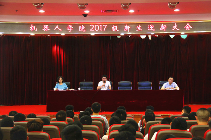 9月16日下午,机电工程系(机器人学院)2017级新生迎新大会在远教楼负一楼报告厅举行,机电工程系主任舒大松、党总支书记姜科跃、校企合作方深圳连硕负责人、优秀毕业生代表以及全体2017级新生出席本次会议。会议由姜科跃主持。