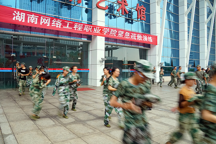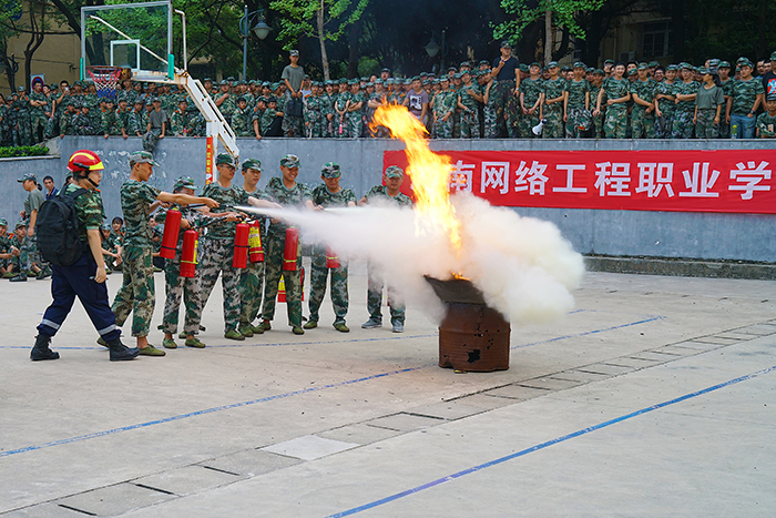 随着一声警报声响起,总指挥宣布疏散逃生演练开始,全体人员按照顺序,低头弯着腰沿着指定安全通道,快速、有序地撤离危险区域,到达安全地带。最后在篮球场前坪让新生“亲自”体验灭火器灭火。