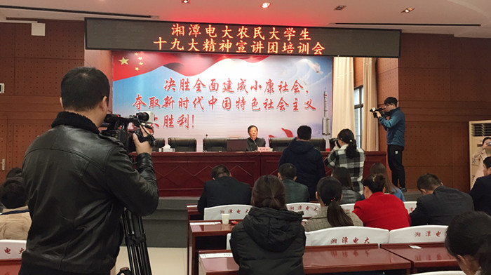 11月29日下午,湘潭电大组织农民大学生代表在实训楼6楼召开十九大精神宣讲团培训会。能容纳两百人的报告厅座无虚席,从数以千计的农民大学生中遴选出的学员代表们有的屏息聆听、有的奋笔疾书,端坐在主席台上为他们进行宣讲的是十九大代表、韶山村党委第一书记毛雨时。作为基层党建工作的领跑者,年过古稀的毛雨时是一名有着35年党龄的老党员,已连续五届当选党的十五大、十六大、十七大、十八大和十九大代表。