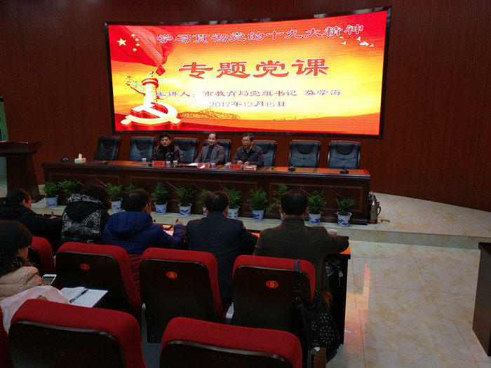 12月15日上午,益阳市教育局党组书记莫学海赴益阳电大讲授学习贯彻党的十九大精神专题党课。电大全体在职党员、副科级以上中层干部50余人在多功能报告厅参加了党课辅导。会议由党委书记曹卫兵主持。