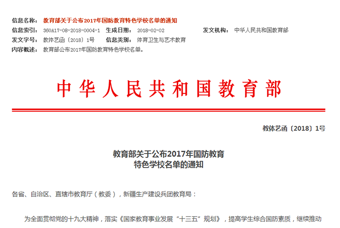 教育部近日印发《关于公布2017年国防教育特色学校名单的通知》,综合认定北京大学等学校为“国防教育特色学校”。湖南网络工程职业学院名列其中,湖南省仅7所本科院校和3所高职(专科)院校入选。