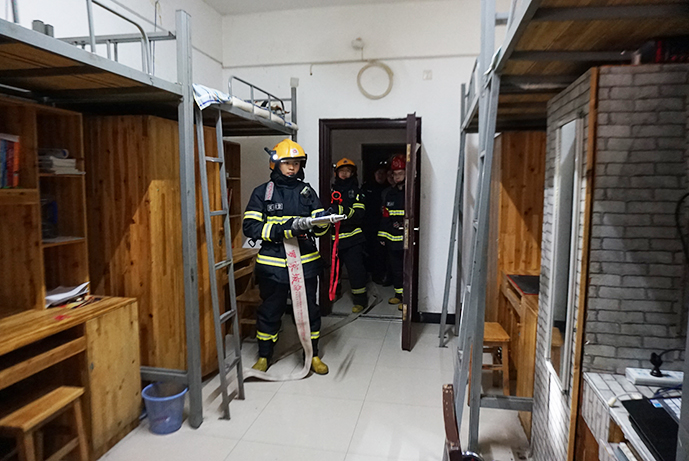 在开展实战演练前,保卫处处长肖胜旗向消防官兵介绍了学校区域的分布情况,因考虑学生公寓是高密度学生群居住的地方等因素,最终选择在学生公寓第六栋进行演练。消防官兵详细检查了公寓内部的室内消防栓、疏散通道和灭火器等消防设施,经过对第六栋学生公寓进行全方位了解后,中队官兵结合灭火救援预案进行分工。演练中,假设公寓的204房间某个部位着火,随着带队的中队长的一声令下,消防演练正式拉开序幕,在短短三分钟的时间内,消防中队官兵各就各位,消防水带很快部署完毕,对着火部位进行灭火扑救。攻坚组对火势进行堵截合围,最终将火势全部扑灭。在整个演练过程处置程序有条不紊,达到了演练的预期效果。随后,消防官兵一同检查了学校的微型消防服务站,对微型消防站值班人员和启圣物业保安人员进行了消防培训,如何正确折叠消防水带,使用水枪、如何使用灭火器进行灭火,并指导对其有序的摆放,以防发生突发事故,迅速接上水枪,达到扑救初期火灾能力。