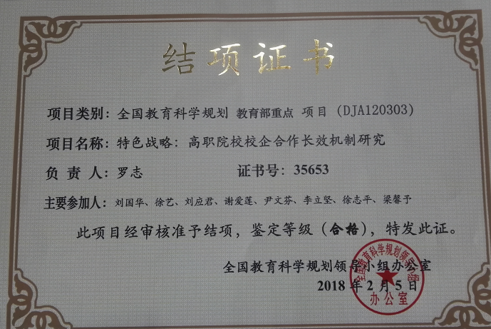 近日,从全国教育科学规划领导小组办公室传来喜讯,我校正校级督导罗志教授主持的全国教育科学规划教育部重点项目《特色战略:高职院校校企合作长效机制研究》(DJA120303)通过专家审核与鉴定,于2018年2月正式结项,结项证书号为35653。