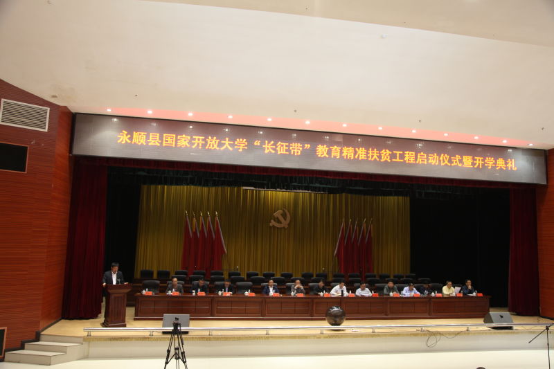 2018年4月23日,春风送暖,初夏相盼,在永顺电大120名农民大学生学员铿锵有力的宣誓声中,永顺县国家开放大学“长征带”教育精准扶贫工程正式启动。湖南电大副校长方林佑、湘西自治州人大常委会副主任刘小刚出席启动仪式并讲话,湘西自治州政协副主席向顶天,教体局副局长向仍淼,永顺县人大副主任余善勇,副县长宋维荣,县委常委、组织部长李延堃,湘西电大校长向阳,永顺电大校长覃海云,省校相关职能部门负责人及永顺电大全体农民大学生学员参加了启动仪式。向顶天宣布永顺县国家开放大学“长征带”教育精准扶贫工程正式启动。