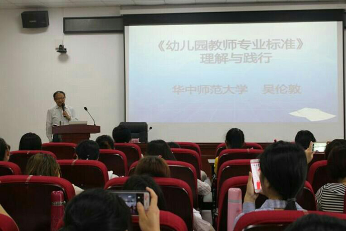 吴伦敦首先提出三个问题:社会赋予幼儿教师的职责和使命是什么?能否解决教不教得好的问题?专业技术水平能否得到社会的认可?引发了在场老师深思和踊跃发言。紧接着吴伦敦教授从《幼儿园教师专业标准》制定的背景、意义、遵从和倡导的基本理念、框架结构与内容、实施建议几方面进行精彩讲解,引导幼儿教师们以幼儿为本、师德为先、能力为重、终身学习。