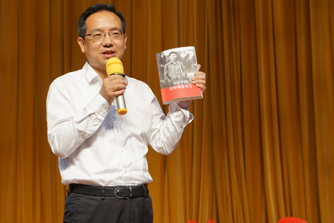 吴敏从不同角度全方位地讲述了习总书记的七年知青岁月,带领同学们探寻总书记艰苦奋斗的青春足印。他深情地告诉同学们,要创造美好生活、获得幸福,必须不懈奋斗。奋斗是幸福之母,幸福的真谛就在于奋斗。最后吴敏将幸福的获得方式总结为“四个在”:在状态 ,在时代 ,在未来,在情怀,引起全场的同学广泛共鸣。