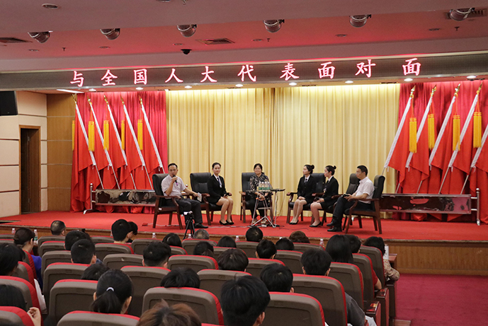 此次座谈会以访谈的形式举行,在吴敏轻松的主持氛围下,庹教授围绕自己参会的见闻和感受,生动细致地向同学们介绍了全国“两会”的概况、主要议程、主要内容、大会亮点和特点等方面的知识。他满怀深情地表示,作为全国人大代表,此次参会对自己是一次升华,进一步增强了“四个意识”,更加坚定了“四个自信”,深刻地体会到作为一名全国人大代表使命光荣,一定要认真履职,不负重托。我校的“三朵金花”也向同学们介绍了她们参加两会的感受及以后的学习目标等等。在场的同学们热情高涨,听得仔细认真,不时掌声雷动,效果很好。