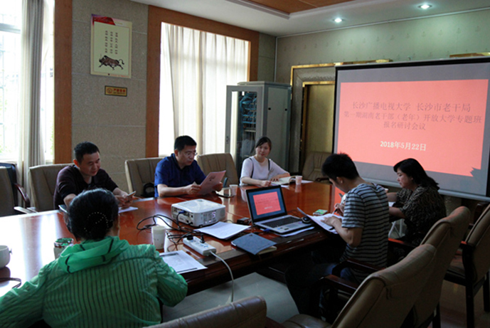 5月22日上午,长沙市委老干局副局长唐安石,长沙市委老干部局老年教育处处长曾光,市老干部大学科员虢利一行到长沙电大,重点就双方如何共同组织参与湖南老干部(老年)开放大学2018年第一期专题班试点工作进行研究和部署。长沙社区大学副校长、长沙电大党委书记林涛和社区教育部全体人员与会。