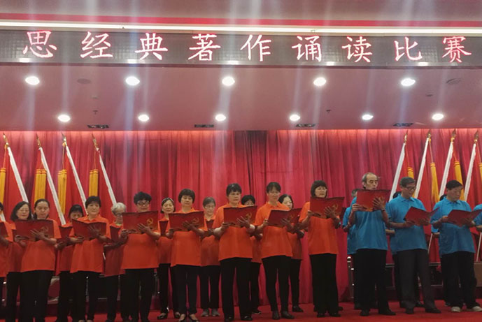 诵读比赛的首个节目由学校离退休老领导们带来,在他们《共产党宣言》(节选)的精彩朗诵声中,诵读比赛顺利拉开序幕。比赛过程中,各支队伍用铿锵有力的语调和饱满丰富的情感,将一篇篇马克思主义经典展现给观众。丰富多彩的表现形式、抑扬顿挫的声声诵读、默契精湛的配合表演将活动气氛推向了高潮。