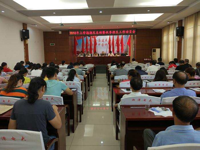 会上,校长伍浩作了2018年上学期期末总结暨秋季招生动员报告。他全面总结了今年上学期各项工作。上学期,在市委、市政府、市教育局的正确领导下,在省电大的关怀指导下,学校高举中国特色社会主义伟大旗帜,全面贯彻党的十九大精神,深入学习贯彻习近平新时代中国特色社会主义思想,以服务湘潭经济社会发展为宗旨,以完善终身教育体系为主题,以建设学习型湘潭为抓手,以改革创新为动力,以加强队伍建设为关键,坚持“开放、灵活、全纳、终身”的办学理念,坚持“一主多辅”的办学定位,积极实施“巩固开放教育、稳定远程教育、发展继续教育、推进社区教育、服务终身教育”的办学思路,努力办好省内一流的开放教育,锐意进取,埋头苦干,各项工作取得了新的进展。主要表现在:一是稳定了学历教育招生规模;二是进一步加快了社区教育发展;三是进一步加强了党员干部教育培训;四是进一步拓展了继续教育培训;五是进一步规范了教学科研管理;六是进一步强化了学校内部管理;七是强化了后勤保障和技术支持;八是扎实做好了创文创卫工作。