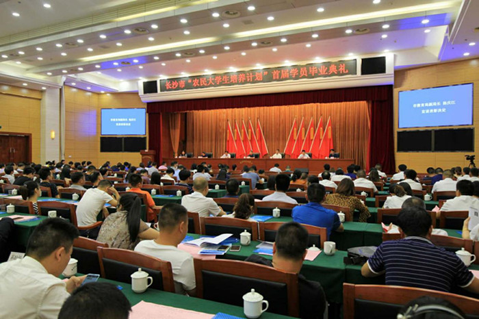 7月31日上午10点,长沙市“农民大学生培养计划”首届学员毕业典礼在长沙市会议中心三楼隆重举行。会议由长沙市教育局副局长杨庆江主持,湖南广播电视大学副校长刘建军,中共长沙市委组织部副部长、市委基层办主任杨俊,省教育厅职成处副处长周韶峰,市财政局副局长熊清溪,市人力资源和社会保障局副局长谭明江,长沙广播电视大学党委书记林涛等出席。各区县 (市)组织部分管副部长,党员教育中心负责人,教育局、财政局、人力资源和社会保障局相关负责同志、市广播电视大学及各区县(市)教学点负责人、分管领导及专干、农民大学生代表参加会议。会上,以纪录片的形式展示了长沙市在实施 “农民大学生培养计划”中取得的成效,向“农民大学生培养计划”首届学员颁发了毕业证,20名优秀毕业生和53名优秀学员受到表彰。