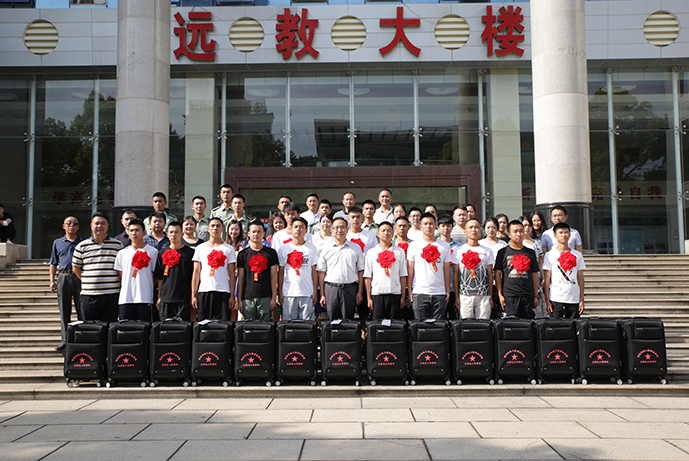 会后,学校领导与大学生入伍新兵合影留念。(武装工作部 田泉)