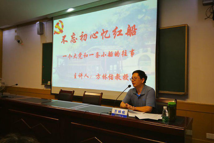 9月25日下午,副校长方林佑在教学楼230教室为财经商贸系教职工、学生党员、发展对象、入党积极分子上了一堂“不忘初心忆红船——一个大党和一条小船的往事”为题的有“场景”的党课。