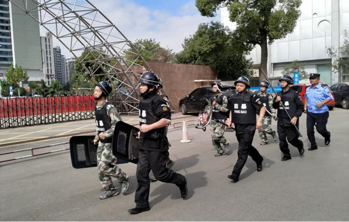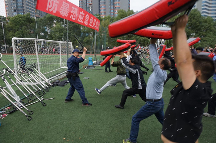 “防暴器材使用是应急处突人员执行任务的基础,只有把训练基础打牢了,防暴人员才能迅速取得主动权。”在集训现场,卿洪华、向阳两位教官给大家手把手示范穿戴防具、使用警械、利用盾牌和脚叉控制犯罪分子等方法。不少参训人员以前只知道盾牌用来挡防、警棍用来敲打,这次学会了盾牌的摆、切、戳等进攻方法,掌握了警棍劈击、戳击、撩击等进攻动作和交叉绞锁技术,懂得了在处置群体性事件中如何运用防暴队形等。为了营造真打实抗训练氛围,教官在演示防暴器材使用时,或相互担任“暴恐分子”,或挑选身强体壮人员扮演“蓝军”,给参训人员一个直观的印象,为集训增强了实效。最后,教师队伍、保安人员、校卫队分别组成3人一组的平暴小分队,在教官的指导下,以战术队形赶赴西校门执行制暴平暴任务,集训取得了圆满的效果。