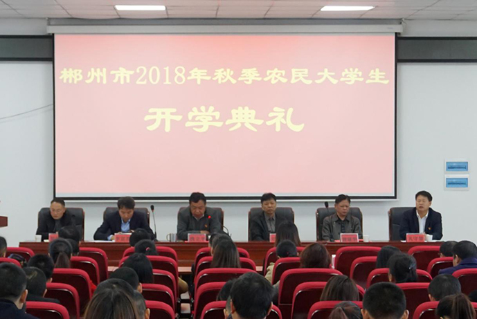 11月9日上午,郴州市2018年秋季农民大学生开学典礼在郴州广播电视大学(郴州社区大学)教学楼六楼会议室隆重举行。市委组织部远教中心主任李富春,市教育局原副局长刘国雄,北湖区组织系统党委专职副书记贺基和,苏仙区委组织部副部长凡守景,郴州广播电视大学党委书记扶立平,党委副书记、校长曾建华,党委委员、副校长陈长春出席开学典礼。市综治办副主任何海清、市农委高级农艺师刘贵权受邀出席当天活动并作专题讲座。开学典礼由扶立平主持。