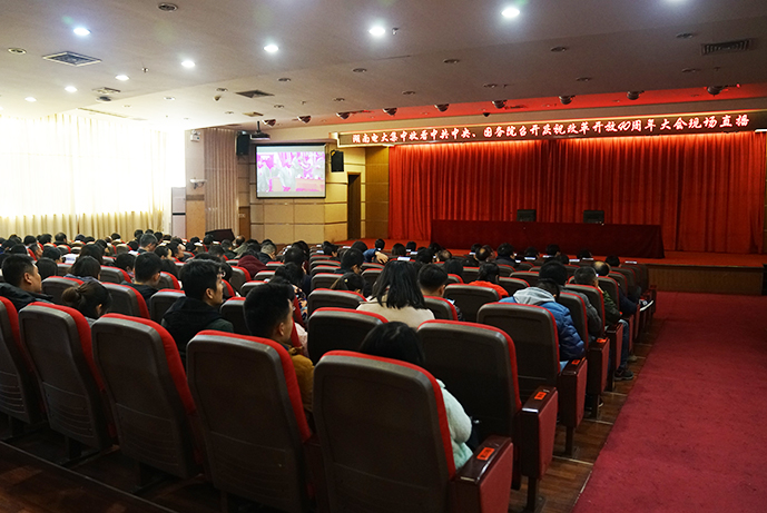 12月18日上午,庆祝改革开放40周年大会在人民大会堂隆重举行,中共中央总书记、国家主席、中央军委主席习近平出席大会并发表重要讲话。学校党委委员、校领导、校长助理、总会计师、科级以上干部、思想政治理论课教学部教师、全体辅导员认真收听收看大会实况,认真聆听习近平总书记的重要讲话。