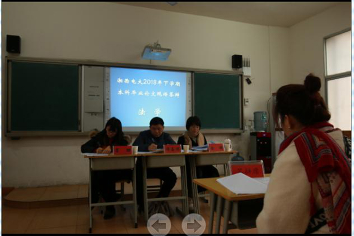 答辩前,答辩教师提前半个小时进入答辩室,审阅参加答辩学生的毕业论文,并准备好要向学员提出的问题;学员验证身份后,按学号依次进入答辩室。答辩中,答辩教师严格按照流程和要求开展答辩工作,学员先用2至3分钟介绍毕业论文选题理由、研究思路及主要成果,然后回答老师提出的3至5个与论文相关的问题,最后答辩教师对学员的答辩情况进行现场点评并给出答辩成绩。答辩全过程由答辩秘书记录在湘西电大教学科研处统一下发的《答辩记录表》中。各组答辩老师以认真、严谨的态度,指出了论文中的亮点和不足,要求学员在答辩后继续修改并能学以致用。
