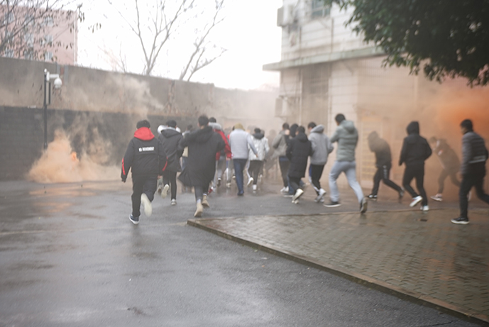 中午1点整,在1栋学生宿舍楼前,随着保卫处副处长江军辉一声令下,李志龙老师吹响了急促的警报声,三个楼梯口顿时冒起了滚滚浓烟,消防疏散演练活动拉开了序幕。警报声就是命令,虽然此时天空突然下起了倾盆大雨,但演练还是如期展开。听到警报声后,32名校卫队队员立即到达指定地点,引导学生快速疏散,保卫处、学生处老师带领学生弯着腰,捂住口鼻,迅速沿着应急逃生通道冒着大雨井然有序地撤离,疏散到室外指定应急避难场所,随即校卫队队员清点人数汇总上报。从警报响起到全部434名学生撤至安全地点,整个逃生过程仅费时3分07秒。
