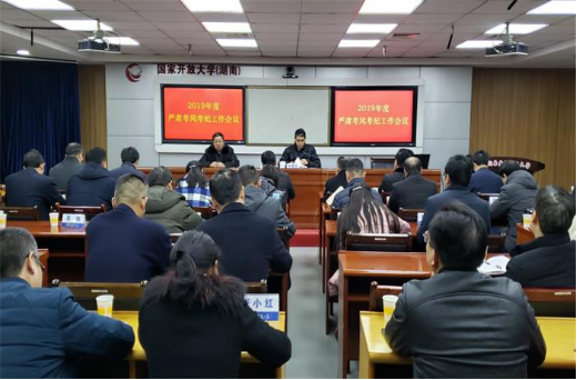 继2019年12月26日全省电大系统2020年春季招生与2019年秋季考试工作会议、2019年12月29日学校2019秋季巡考工作会议之后,2020年1月2日下午,学校党委在远教大楼四楼云教室组织召开2019年度严肃考风考纪工作会议。会议由党委书记陈建民主持,全体党委委员、校领导,全校各部门党政主要负责人参加了会议。接续召开的三个会议,面向系统分校(教学点)、巡(蹲)考人员、党委领导与中层骨干三类不同对象,聚焦同一个主题----“治考”,旨在着力开放教育提质,整肃考风,严肃考纪,落实整治替考行动方案,营造风清气正的考试环境。