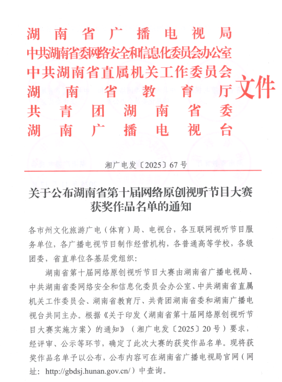 2025年11月26日,湖南省广播电视局正式公布了湖南省第十届网络原创视听节目大赛获奖名单,我校作品《行走的力量》获