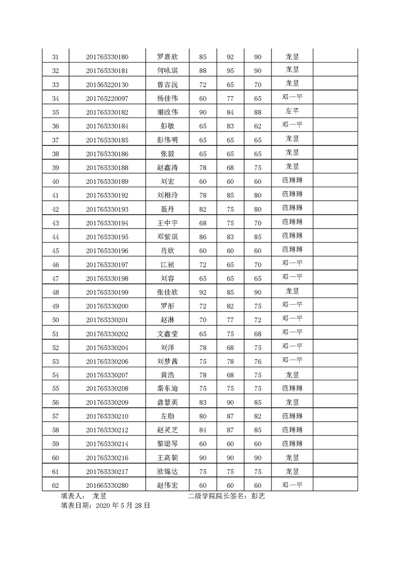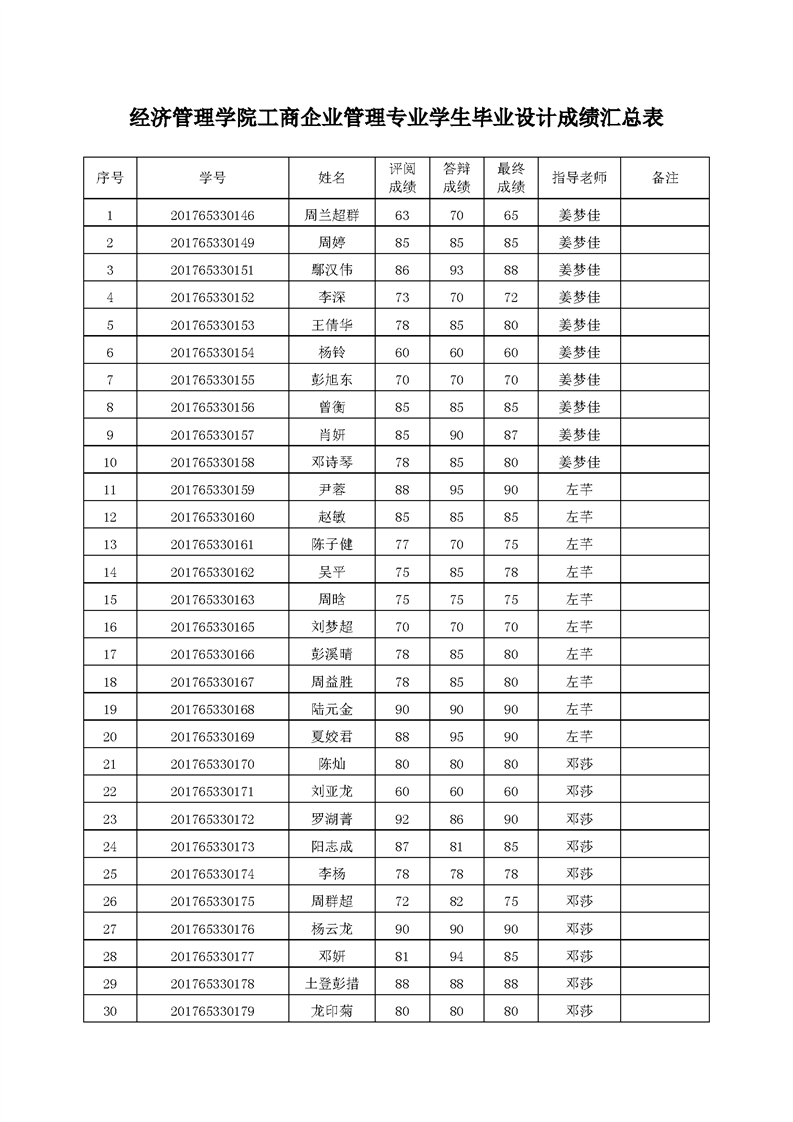 经济管理学院工商企业管理专业毕业设计(含答辩)成绩汇总表