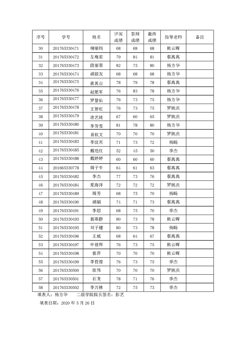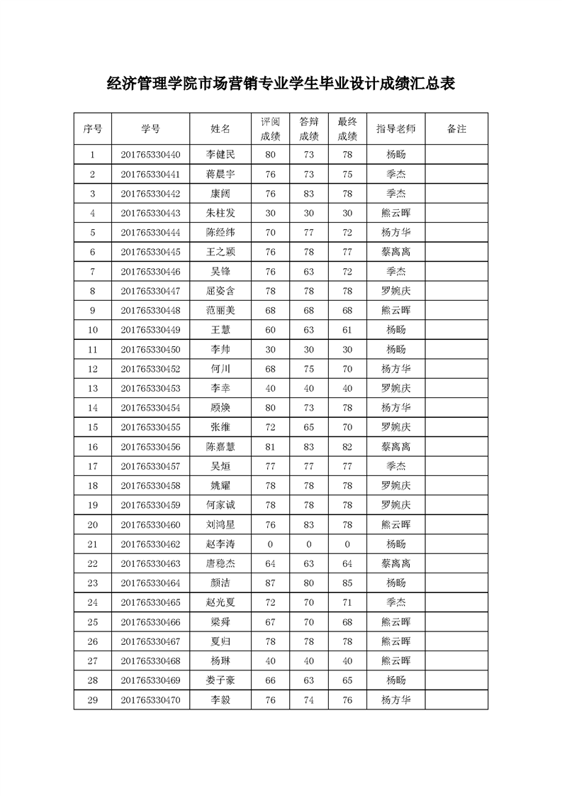 经济管理学院市场营销专业毕业设计(含答辩)成绩汇总表