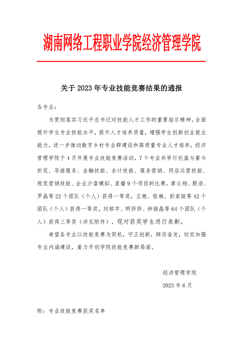 关于2023年专业技能竞赛结果的通报