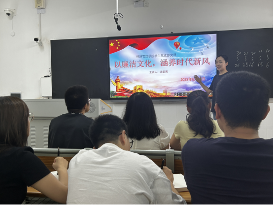 经济管理学院学生党支部于6月21日下午在教学楼237组织党课学习,主题为《以廉洁文化,涵养时代新风》,由学生党支部宣传委员沈亚男老师进行授课。党课主要内容为:清正廉洁的重要性、如何做好清正廉洁、清正廉洁的先进代表三个方面。作为一名高校教育工作者,我们始终要坚持清廉自学、志行高洁;一身正气、两袖清风;洁身自好、克己奉公;我们要干干净净做事,老老实实做人,守住廉洁自律底线。