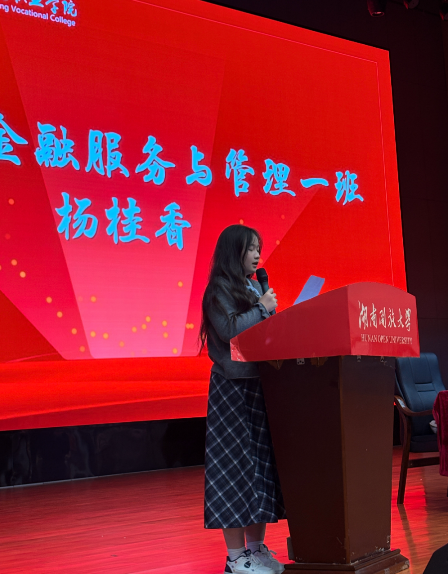 2023级金融服务与管理一班蔡科宇分享了自身从普通学生到成长为一名学生干部的心路历程;2025级金融服务与管理一班新生代表杨桂香从军训训练视角出发,深刻感悟到“个人与集体共成长”的内涵。