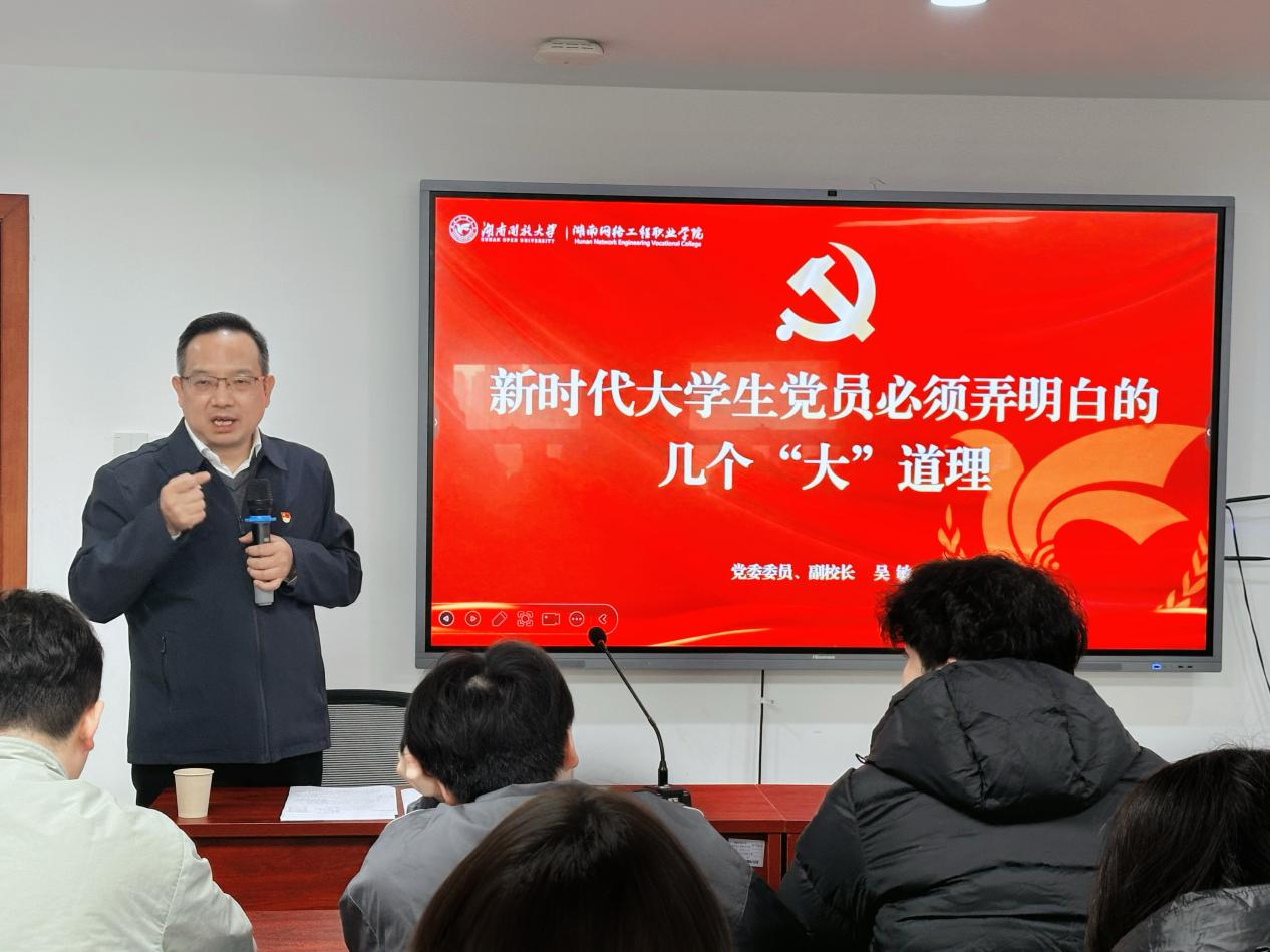 吴敏副校长从大学生党员日常学习生活中常见的“小道理”出发,围绕现实情境中如何应对矛盾、处理人际关系等具体问题,引导学员由表及里、由浅入深,深入思考党性修养的时代内涵与实践路径。在此基础上,他聚焦“治国理政”这一宏大主题,系统阐述了新时代大学生党员必须深刻理解与把握的四个“大道理”:一是深刻领悟“三个为什么”的历史逻辑与理论逻辑——马克思主义为什么行、中国共产党为什么能、中国特色社会主义为什么好;二是准确把握“五项重大原则”的核心要义,即坚持党的全面领导、坚持中国特色社会主义道路、坚持以人民为中心、坚持深化改革开放、坚持发扬斗争精神;三是厘清“五个必由之路”的历史脉络与现实指向;四是认清新时代新征程中推进中国特色社会主义事业最为紧要的战略问题与使命任务。