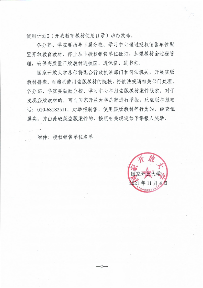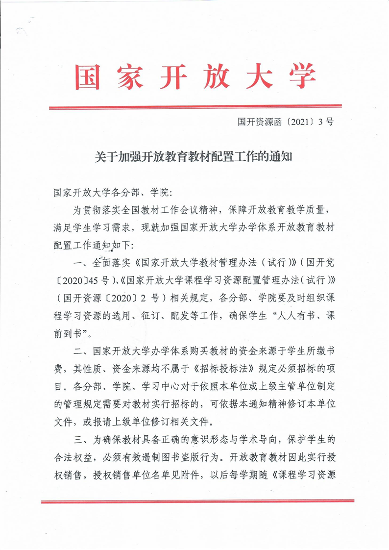 转发国家开放大学《关于加强开放教育教材配置工作的通知》