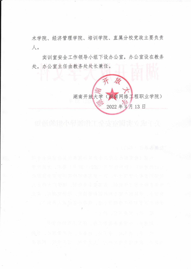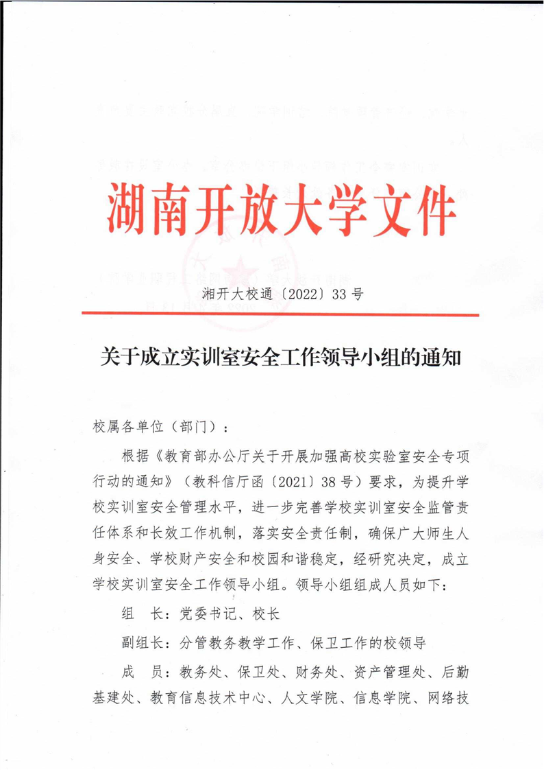 湖南开放大学关于成立实训室安全工作领导小组的通知