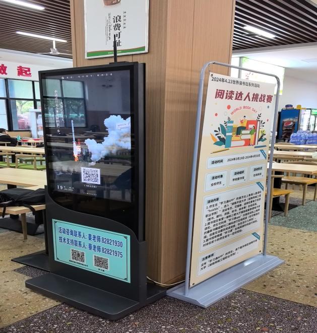 为庆祝第29个世界读书日和倡导广大师生读好书,营造勤奋、乐学的学习氛围,图书馆于近日在学校食堂一楼和三楼各摆放了一台电子阅读机,并开展了全校师生阅读达人挑战赛活动。