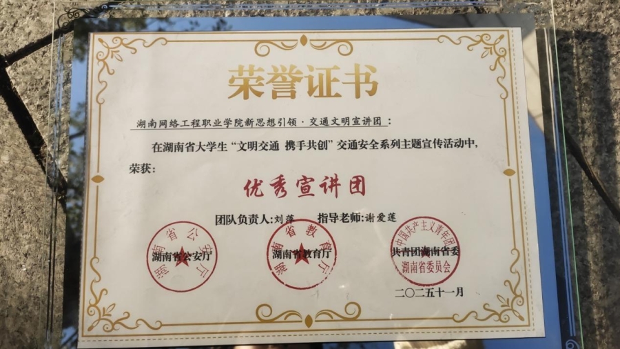 日前,2025年湖南省大学生“文明交通 携手共创”交通安全系列主题活动评选结果正式公布。我校习近平新时代中国特色社会主义思想研学社(简称“习研社”)牵头,联合校广播站共同组建的“新思想引领·交通文明宣讲团”在全省范围内表现突出,获省级“优秀宣讲团”荣誉称号。