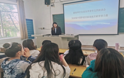 2021年4月29日13时,人文学院学生会全体学生干部在教学楼240教室,学习许达哲书记在全省各界青年五四座谈会上的讲话。学习过程中,人文学院学生会指导老师谭琰播放新湖南公众号《湖南举行全省各界青年五四座谈会 许达哲出席并讲话》视频、诵读湖南日报公众号《青春是什么样子?听听湖湘青年代表怎么说》通讯。学生干部们以许达哲书记在全省各界青年五四座谈会上的讲话为指导,从自身实际出发,讲述了自己的思考、理解和感悟,其中模拟主席周乐谈到:“我被共青团高扬的信念旗帜和革命精神激励着,被新时代优秀湖湘青年的突出事迹影响着。我应向楷模学习,时刻牢记习近平总书记对湖湘青年的殷殷嘱托,传承红色基因,展现湖湘青年的时代担当,为实施“三高四新”战略、建设现代化新湖南做出自己的贡献!”她的精彩发言让在座的学生干部深有体会。