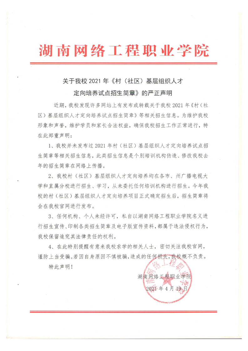 关于我校2021年《村(社区)基层组织人才定向培养试点招生简章》的严正声明