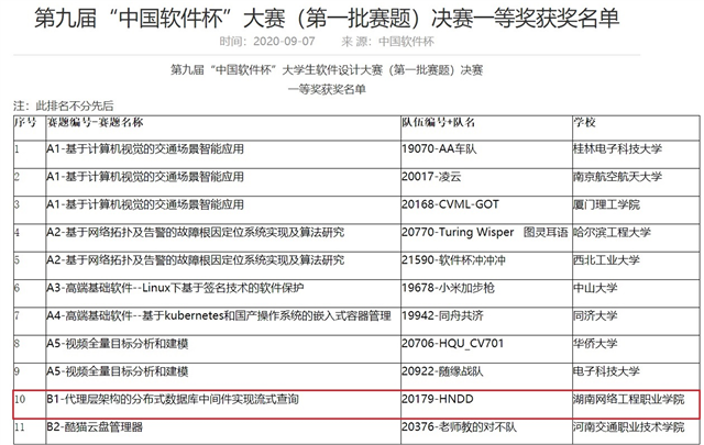 9月7日,第九届“中国软件杯”大赛(第一批赛题)正式落下帷幕。经过初赛,决赛企业老师答辩、决赛高校老师答辩3个阶段的激烈角逐,我校信息学院软件技术专业陈彩华老师指导的陈广、刘珺、朱志杰团队脱颖而出,斩获了赛题《代理层架构的分布式数据库中间件实现流式查询》的全国一等奖,这是继该赛项开设以来,湖南省代表队获得的最好成绩!