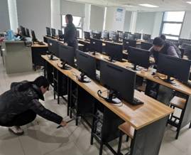 信息学院的老师们分工合作,领取拖把、一次性口罩、垃圾袋,配置消毒药水,戴上一次性手套,以教研室为单位,按分配区域各自展开卫生打扫及消毒工作。在清洁消杀过程中,各位老师不怕脏、不怕累,一直忙碌在终教楼及实训楼各个机房,不仅对机房进行全面清扫和消杀工作,而且对学生经常触碰的显示屏、键盘、鼠标、座椅等物品和区域进行认真清理,反复消毒,不留死角,确保消杀彻底,用实际行动确保学生的顺利返校开学。