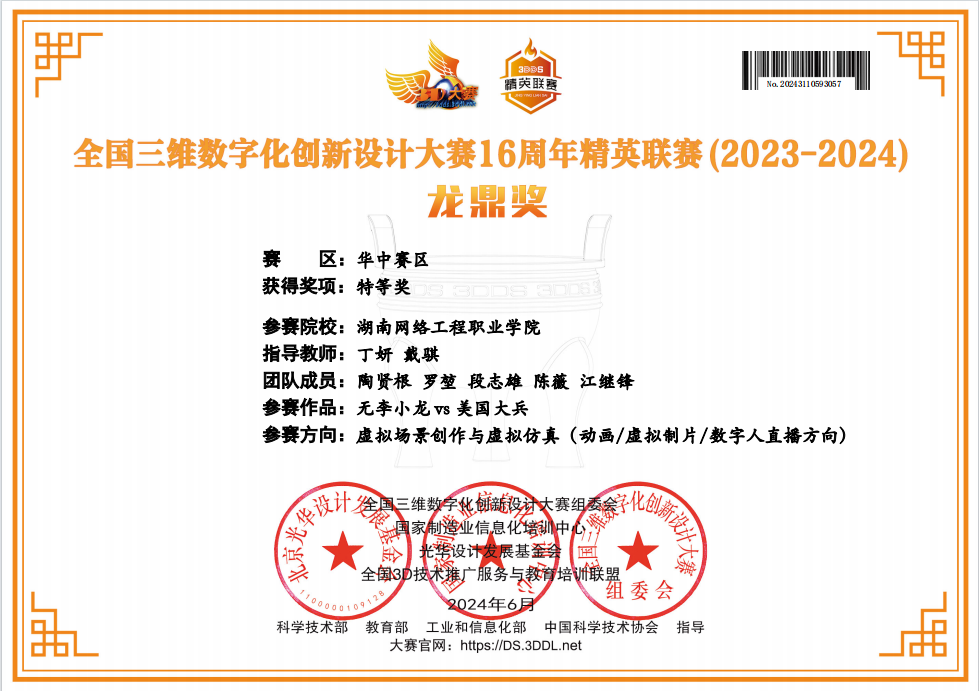 本次华中区选拔赛涵盖了虚幻引擎、3D模型、动捕技术、后期剪辑等模块,全面检验了参赛选手的三维软件与虚幻引擎的综合运用。陶贤根同学带队的作品,在华中地区9所职业院校与25所本科院校一共80支队伍中脱颖而出,获得了全华中赛区特等奖,是湖南省唯一取得国赛资格的参赛队伍,并将在2024年6月份同全国102支队伍一起角逐国赛现场决赛。团队在华中赛区选拔赛结束后依然刻苦努力继续备赛至今,学生在知识结构、数字素养和职业技能等方面都有大幅跃升,得到的远远不止是这个奖项,更多的是备赛过程中的收获和实践经验的积累。