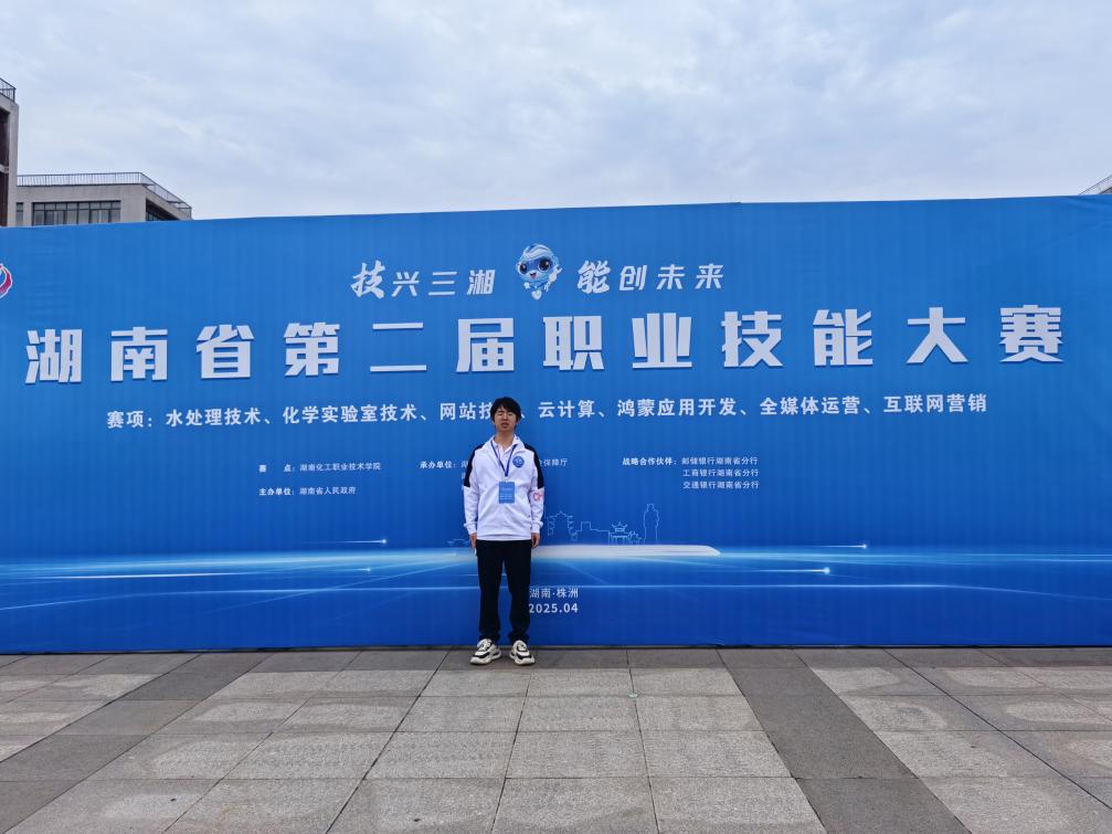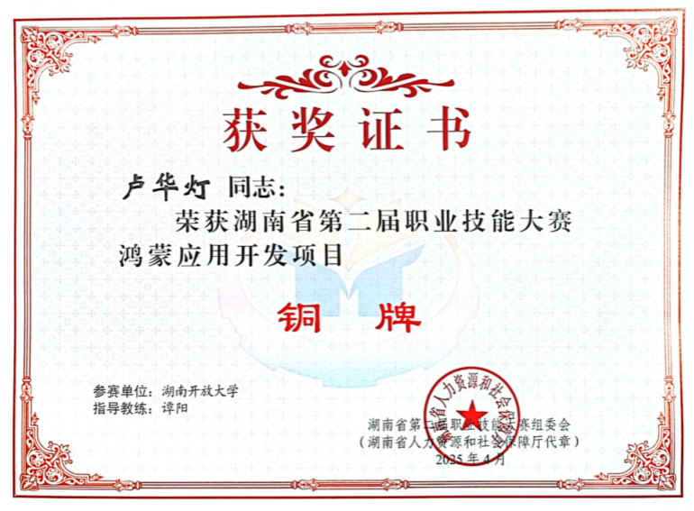 近日,以“技兴三湘 能创未来”为主题的湖南省第二届职业技能大赛在株洲圆满落幕。我校信息工程学院师生在赛场上奋勇拼搏,凭借扎实的专业功底与精湛的技术能力斩获多项荣誉:教师卢华灯与学生刘烨参与鸿蒙应用开发赛项,卢华灯荣获铜奖,刘烨夺得优秀奖(第四名);教师马萌征战云计算赛项,同样以第四名的成绩摘得优秀奖。此次获奖充分展现了我院在信息技术领域的教学实力与人才培养成效。