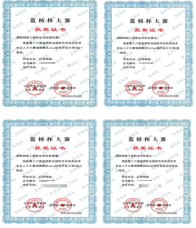 近日,第十六届蓝桥杯大赛(软件赛/电子赛)省赛圆满落幕。我院2023级软件技术专业学生参与“Java软件开发”、“Python程序设计”、“Web应用开发”赛项,其中廖钧豪获Java软件开发一等奖、李靖蕾获三等奖;史章志获Python程序设计获得一等奖;袁以获web应用开发获得二等奖。