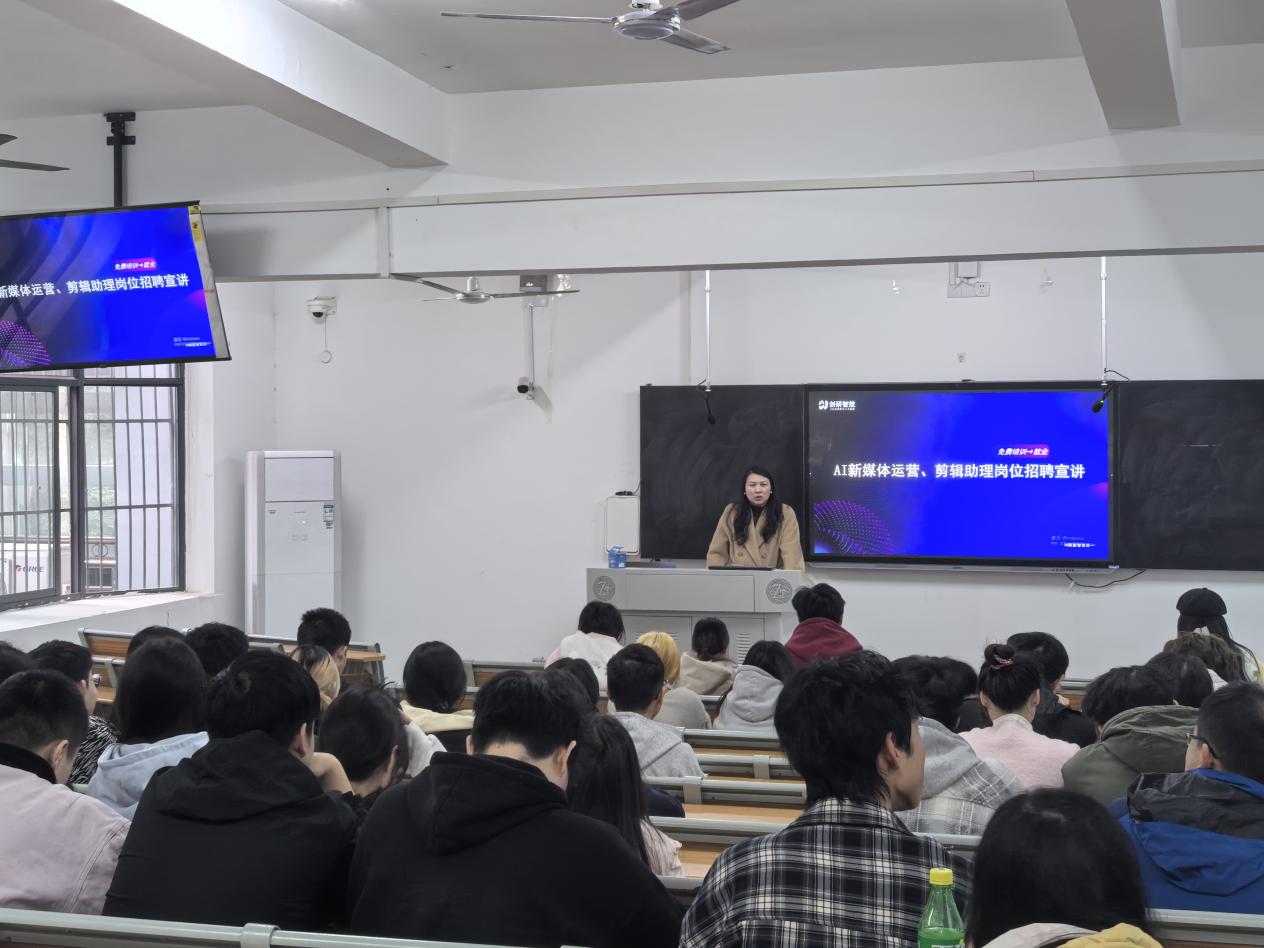 招聘宣讲环节,企业负责人详细介绍了集团的发展历程、技术优势与人才培育机制,重点解读了AI新媒体岗位的工作内容与发展前景。该岗位聚焦AI内容创作、智能投放运营及数据决策分析等方向,为学生提供了融合技术与创意的实战平台。