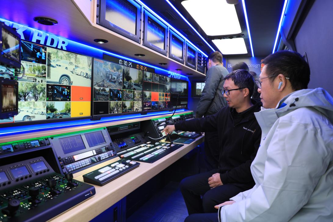 活动中,学生们积极参与互动体验。在技术人员指导下,部分学生尝试了讯道机位拍摄、现场切换、音频混音和信号监测等操作,对IP网络架构、PTP时间同步、信号封装等关键技术有了更深入的认识。数字媒体专业楚怡本科大二学生刘萍同学感慨道:“以前只在电视上看到过转播车,今天亲眼看到它在真实场景中运行,才真正理解其意义。这辆车就像一个移动的‘智慧媒体实验室’,也让我对数字化制作有了更好的理解。”