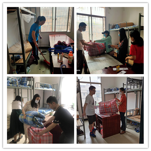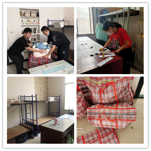 各学院在尊重学生隐私的前提下,征得学生意见后于5月14日开展宿舍布置工作。各学院总支副书记、学工办主任、辅导员进入所管学生宿舍,配合学生公寓中心做好学生寝室物品清理和封存。辅导员们通过线上视频与学生沟通物件的保存情况,并帮助学生清理物品,进行登记,打包。在隔离宿舍清空后,学生公寓管理中心将对隔离宿舍进行卫生打扫,开展消杀工作。