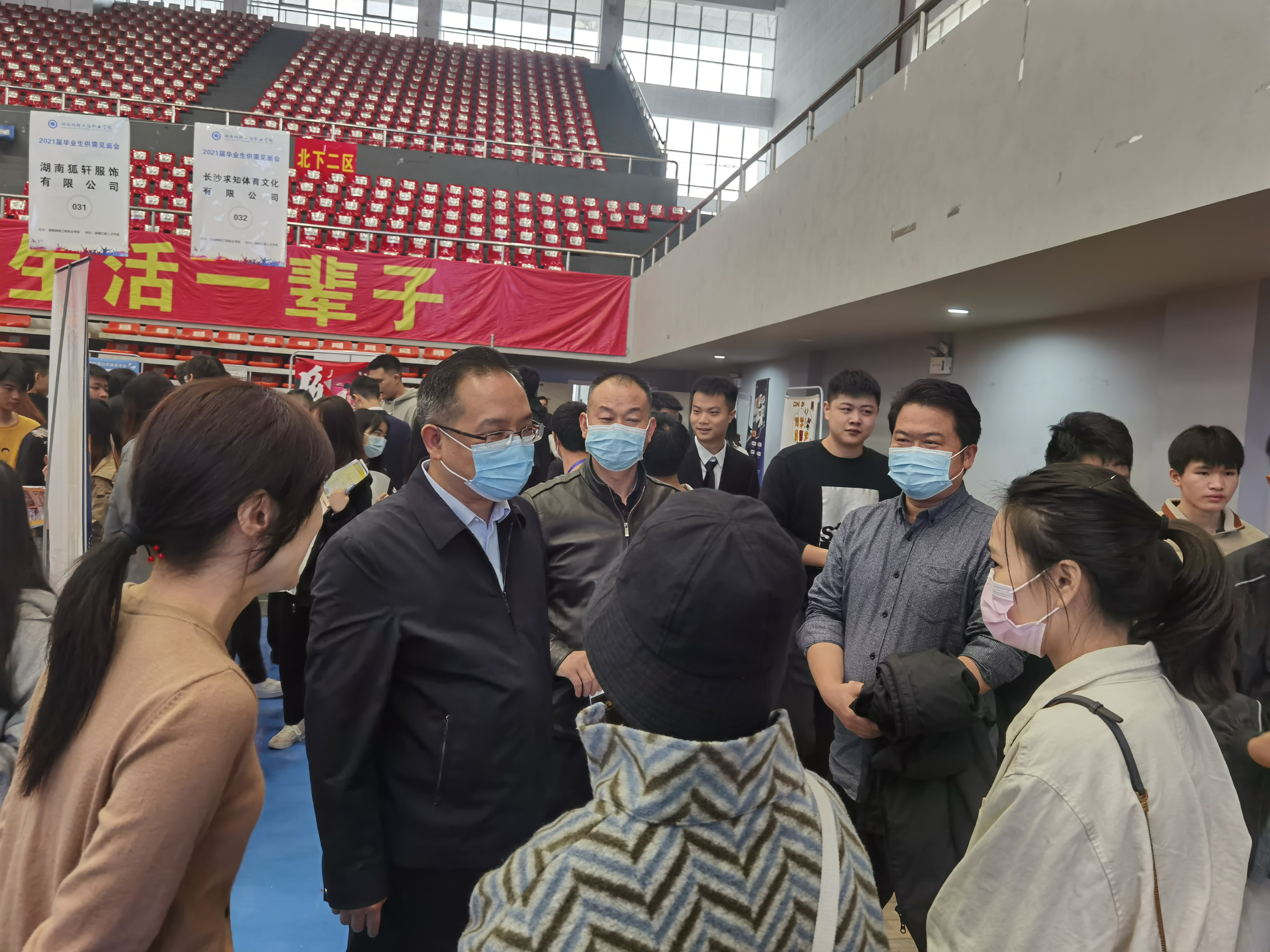 为贯彻落实党中央、国务院以及教育部和湖南省关于就业工作的决策部署,落实落细“保民生、稳就业”的总体要求,积极促进2021届毕业生顺利就业,11月6日,由校学生处就业创业指导服务中心举办,红星人才市场协办的毕业生秋季大型现场招聘会,在学校体育艺术馆举行。这是疫情以来我校组织的首场现场招聘会,副校长吴敏及各学院院长和书记赴招聘会现场指导工作。