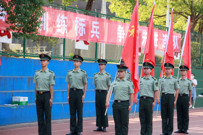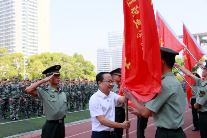大会最后,吴敏副校长为2022级新生军训团授团旗旗、王宇委员为军训各营授营旗、主席台领导们为军训各连队授连旗,全体参训学员在田径场整齐地排列,这一刻,接过的是军训旗,接受的是光荣使命。