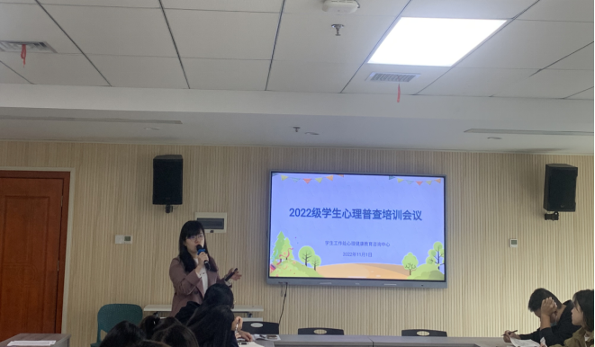 刘微认真阐述了测评系统的使用流程和注意事项,以及测评过程中可能遇到的问题与处理方式,同时就新生心理普查工作进行了具体的安排。