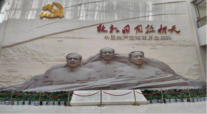 走进湖南党史陈列馆展厅,首先映入眼帘的是名为“潇湘魂”的毛泽东、刘少奇、任弼时伟人雕像,塑像亲切、伟岸,大家的敬仰之情油然而生。陈列馆以“敢教日月换新天”为主题,通过文字、图表、照片、油画、地图、历史信件、书籍、物品、场景模拟、3D投影等各种形式和手段,展示了新民主主义革命、全面建设社会主义、改革开放三个历史时期三湘儿女在党领导下的奋斗历程,重点展示了湖南党史军史人物的光辉业绩。让大家对党的艰辛历程有了更加深刻的了解,也对建党以来所取得的成绩感到由衷的崇敬,特别是近十年以来取得的巨大成绩,更是让全体党员为之奋进鼓舞。