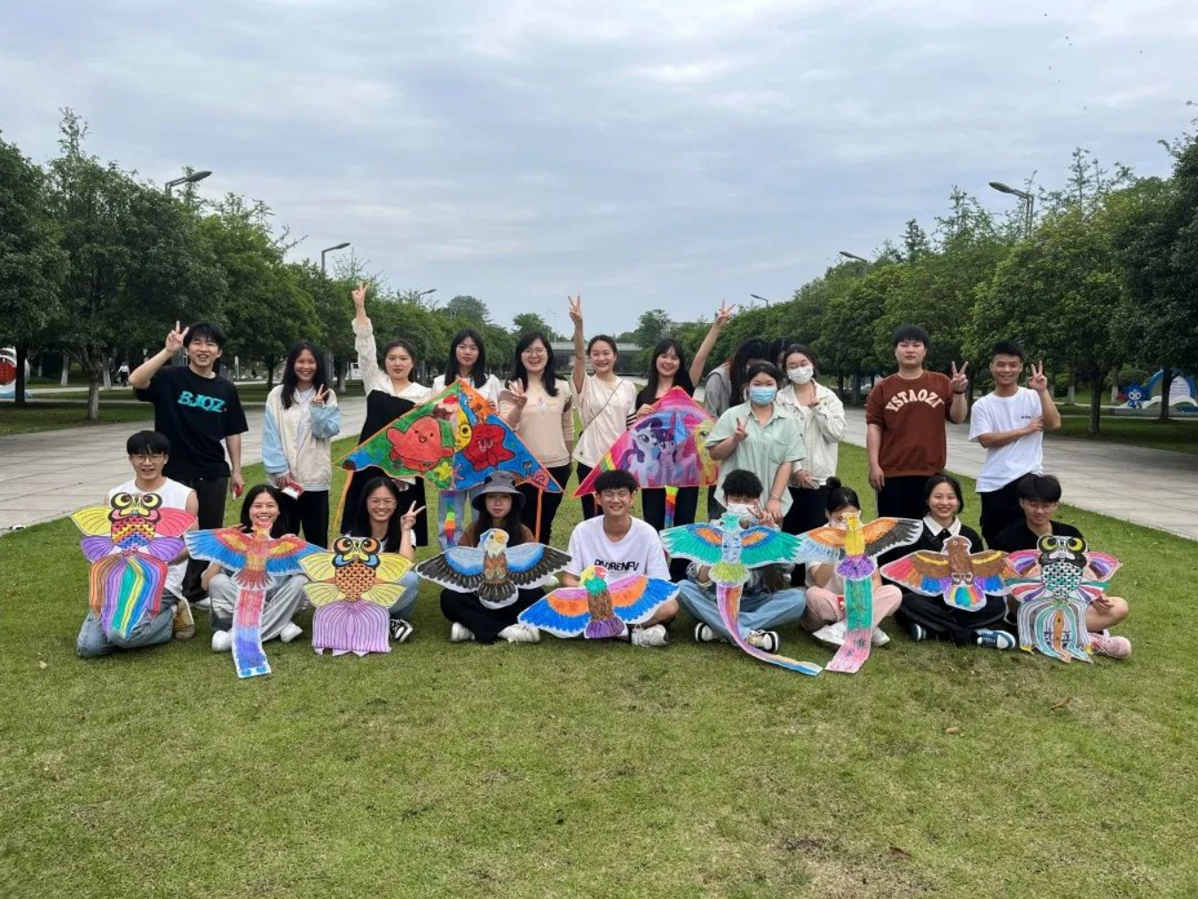 活动伊始,同学们领取风筝的基础材料后三两人围坐在湘府文化公园的木凳上进行涂鸦,将心中的色彩与想象跃然风筝之上,让风筝重新焕发生机。